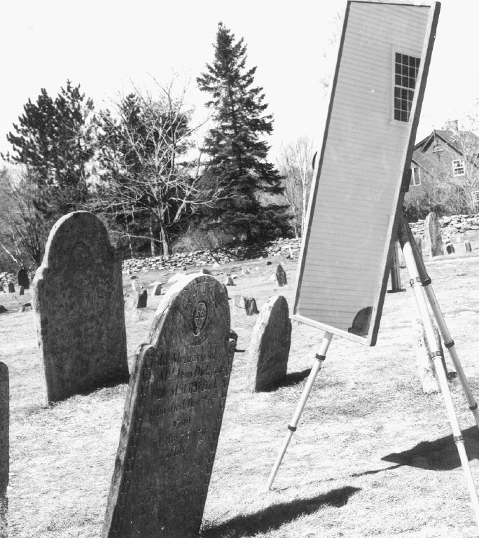 Use of mirror to throw sunlight onto shaded gravestone.