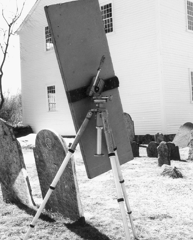 Use of mirror to throw sunlight onto shaded gravestone.