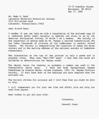 Correspondence of 5/95 from Kenneth Jones to Noah Good re: the Philip Bechdold stone.