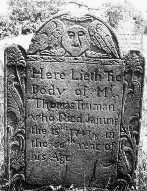 The following entry, from Joshua Hempstead Diary/Account Book, is for a stone for T. Truman. It may be for some other Truman marker, although the dates and location suggest this Thomas Truman. Aug. 29, 1753: "...I was at home all Day. finisht Engraving T. Trumans Stones."